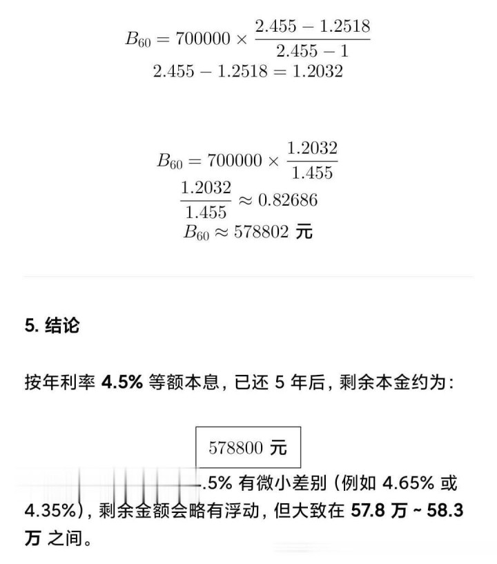 算了一下贷款,当年100万,他付了三成的首付,贷款70万,还了5年的贷款,现在本金还剩58万左右。